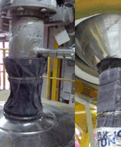 连接进出大型筛子的软连接是用抱箍固定的标准帆布套管。 这些工位没有做到粉末和气体密封,潜在的有害颜料粉尘常常泄漏到环境中,给员工带来真正的健康风险。工作人员经常用各种办法包括胶布,尝试改进其密封性。